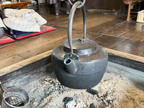 〈懐かしい囲炉裏の温かみを背にしてくつろぎました〉