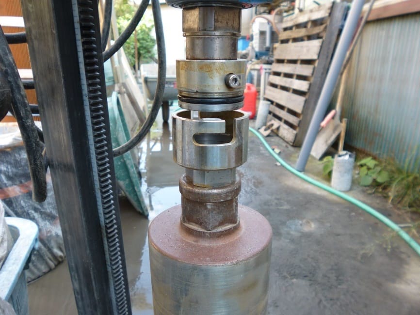 コアカッタの本体とダイヤモンドビットは、ねじ継ぎになっていますが、ねじが締まる方向に回転させて掘削するので、