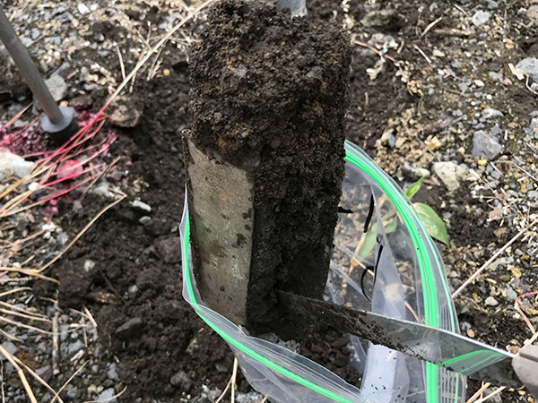 土壌試料採取の様子です。ハンドオーガに取り込まれた土壌試料は、チャック付きのビニール袋に詰め、分析工程へと移行します。