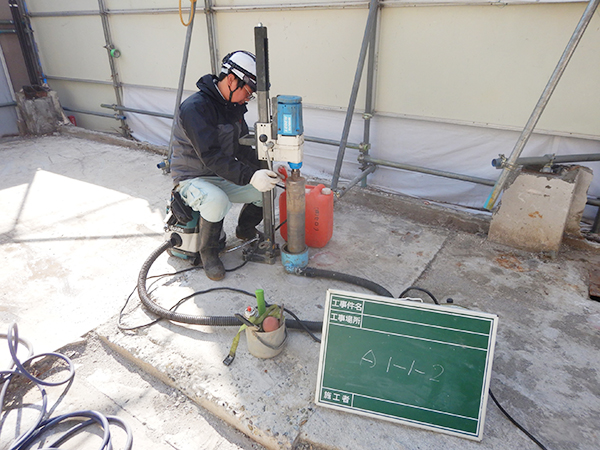 アスファルトやコンクリートで被覆された調査地点では、コアカッタなどで、被覆部を掘削する、いわゆるコア抜きをします。コア抜きをして、アスファルトなどの下地となっている砕石を除去して、地表面を露出させます。