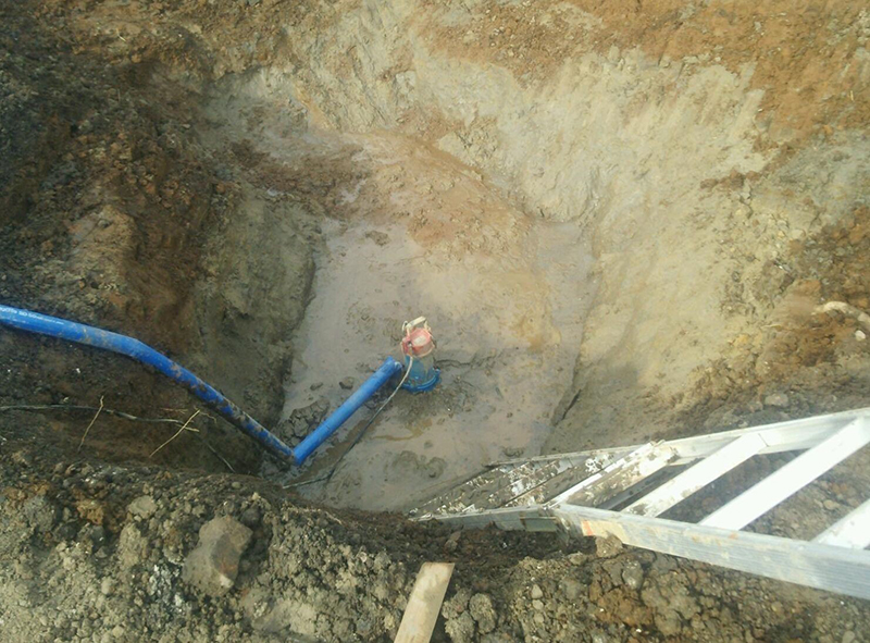 周辺を掘削する前に、増し掘りして深度を下げて、水中ポンプで排水し、地下水位を下げます。