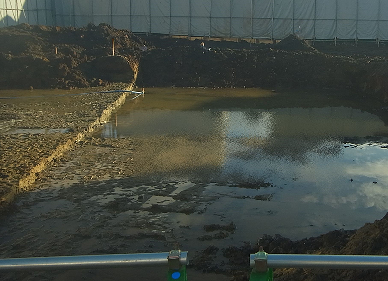 まずは釜場と呼ばれる、貯水場を作って排水し、地下水位を下げ、そして汚染土壌の掘削除去に移行します。
