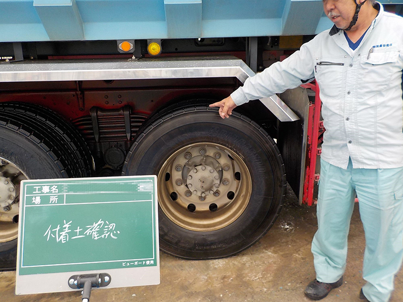 ダンプカーの運転者は、タイヤに汚染土壌の付着がないかの確認をします。