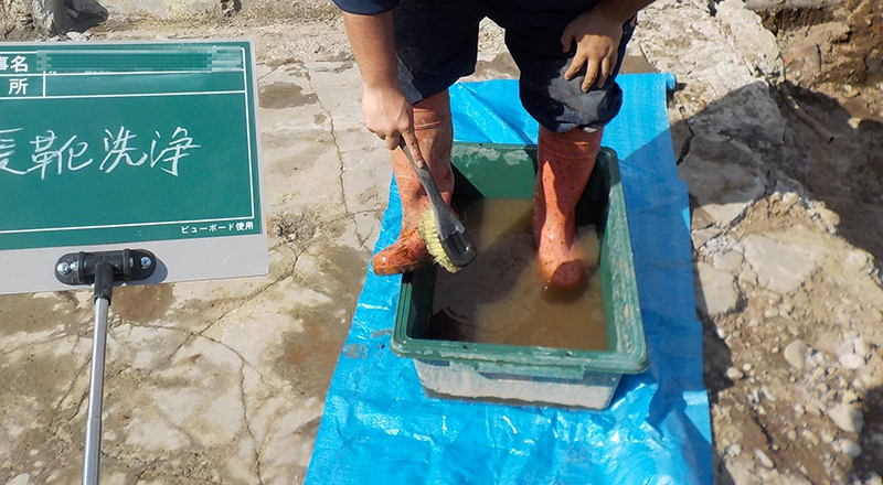 汚染の範囲から作業員が移動するときは、長靴を洗浄するか、靴を履きかえ、汚染土壌の拡散を防止します。