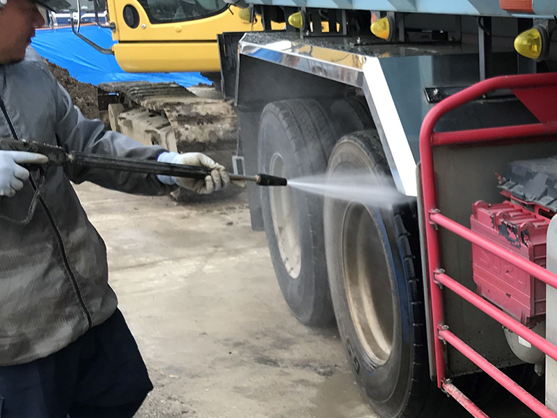 ダンプカーのタイヤを洗浄する専任の作業員がいて、場外への汚染土壌の拡散を防止します。