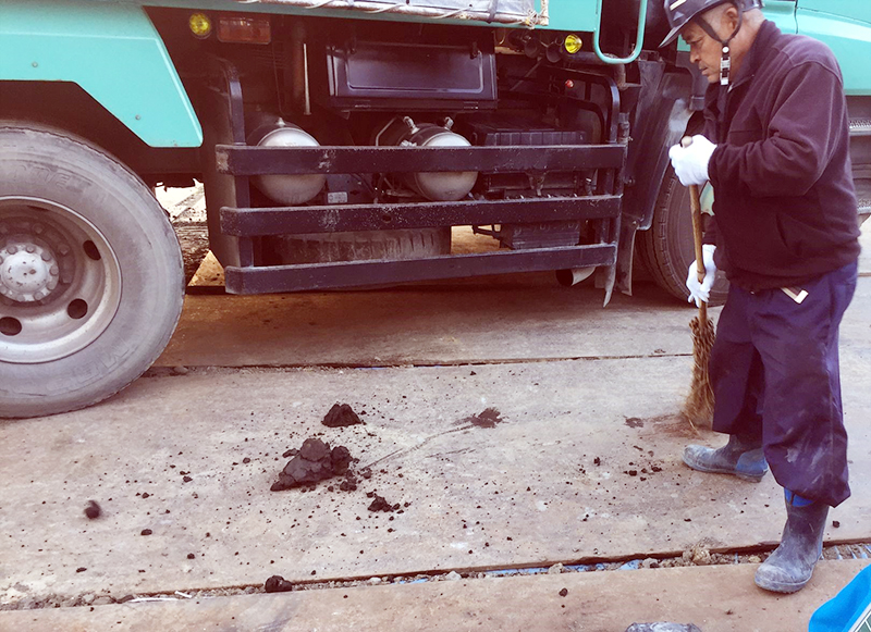 ベテランの油圧ショベルのオペレータが、慎重に作業しても、バケットの裏側に付着した汚染土壌はバラバラと飛散します。これは、どうにもならないので、積込場所には、シートの上に鋼板を敷いて、汚染土壌がこぼれても、健全な地表面に影響のない養生をしたうえで、専任の作業員が、汚染土壌がこぼれるそばから回収するようにしています。