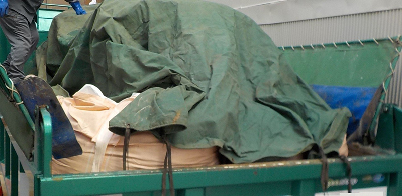 ダンプカーに積み込んでから、さらにシート掛けして、搬出します。