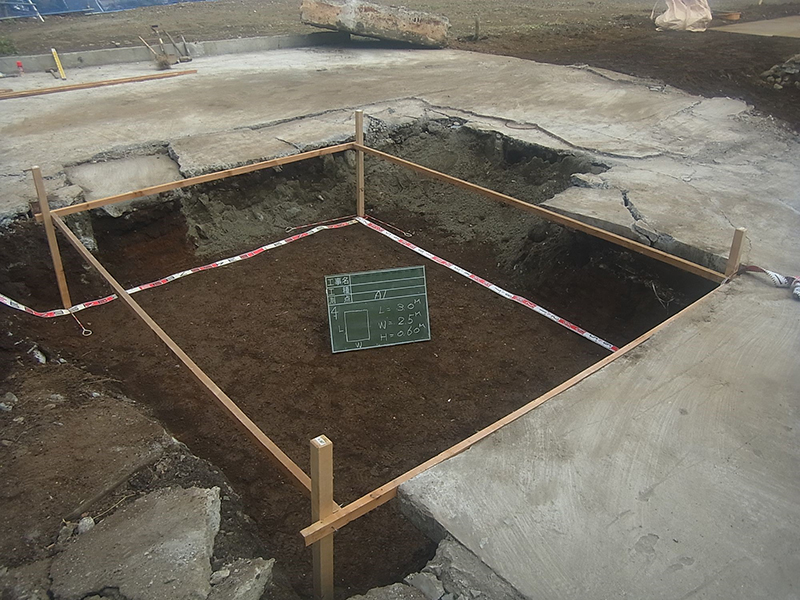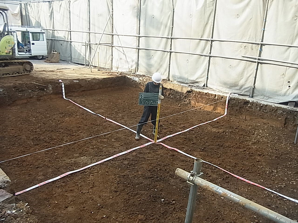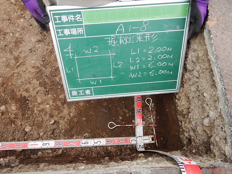 東京都方式は、四隅の平面方向の確認方法も規定されていて、始点と終点の写真を撮影します。 この区画は、短辺方向の長さが2.0mなのですが、両サイドに10cmずつ余掘りし、2.2mで確認写真のテープスケールが読み取れます。