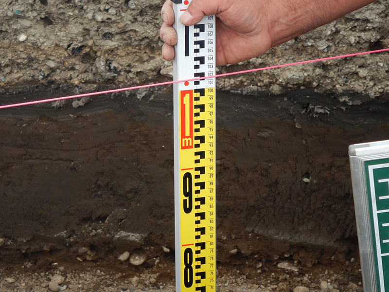 この区画の汚染の深さは0.8m、水糸高さ0.2mなので、スタッフスケールは1.0m以上でなければなりません。土壌汚染対策工事は、掘削範囲の不足は厳禁、大きめに掘る余掘りが基本です、この区画では1.5cm余計に掘削しています。