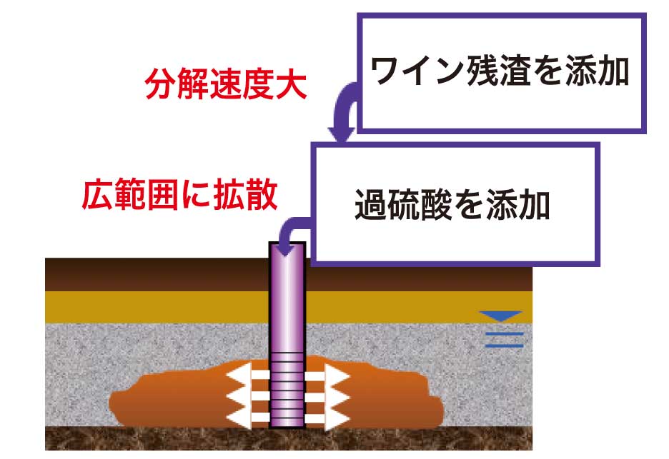 過硫酸を広域に拡散した後に、ワイン残渣注入により分解速度を増加させ、効率的に分解浄化できないか?